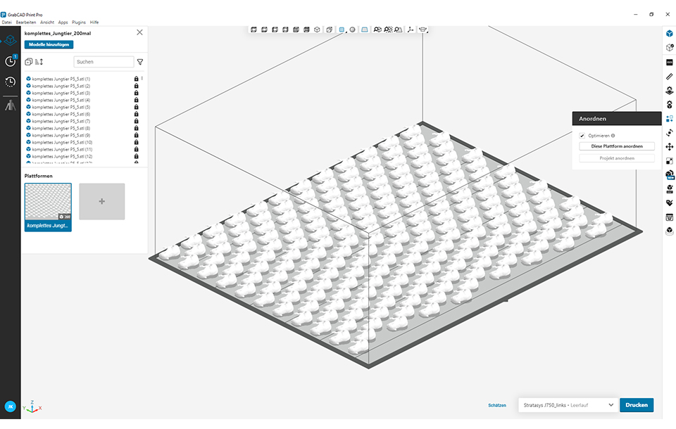 Bestückung der Bauplattform mit 200 Jungtier-Modellen